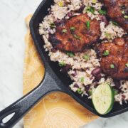 Meanwhile, prepare the rice and beans by heating a pan over medium heat and add about ¼ cup of coconut milk to the pan along with most of the green onions (reserve some green parts to add after cooking) and garlic. Sauté for 4 to 5 minutes until softened. Then add fresh thyme and cook for another minute. Lower heat slightly if necessary to prevent burning.